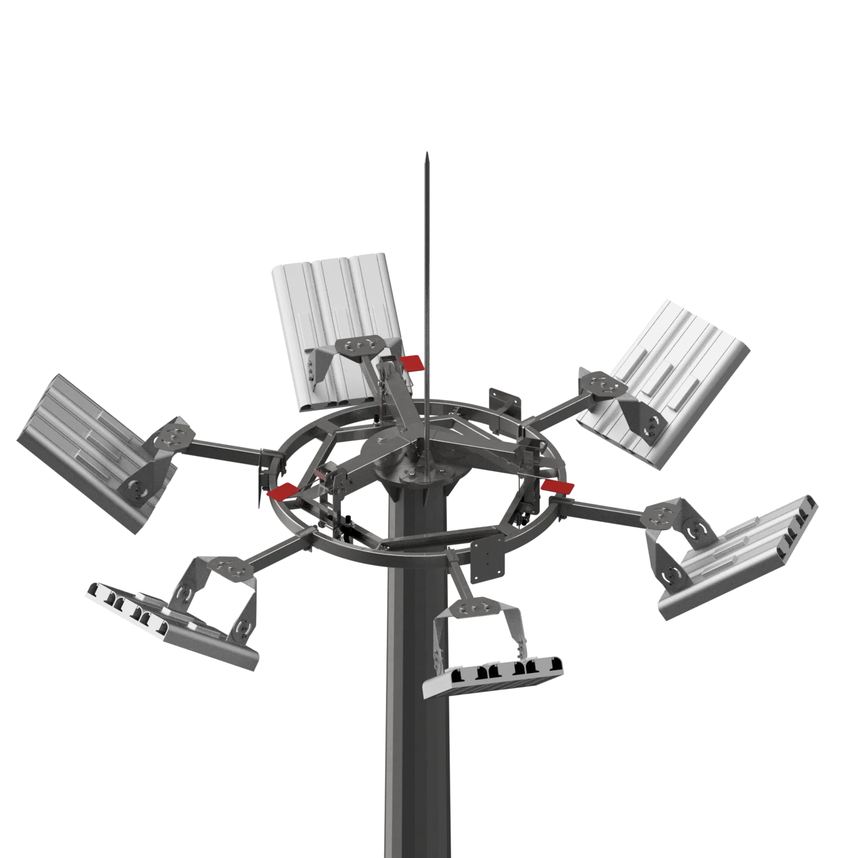 Мачта с мобильной короной — это металлическая опора, на верхней части которой установлена специальная платформа (корона) с осветительными приборами, антеннами или камерами. Главное её отличие в том, что корона может опускаться вниз при помощи механического или электрического привода, что значительно облегчает обслуживание.