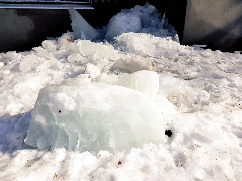 В Свердловской области ледяная глыба сорвалась с крыши жилого дома и рухнула на прохожих. Под удар попали две женщины, девятимесячный ребёнок в коляске и собака.