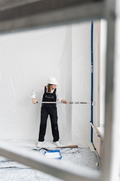 Процесс нанесения белой краски на верхнюю поверхность помещения