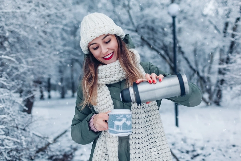 Также стоит избегать напитков с ментолом, которые активируют рецепторы холода, и горячего чая с мёдом или малиной на улице из-за его потогонного действия. Врач рекомендует брать на прогулку какао (оно даёт длительную энергию), напитки с имбирём, безалкогольный сидр или морсы из клюквы и облепихи, богатые витамином С.